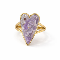 Une bague plaqué or ornée d’un cœur d’améthyste brute, aux éclats naturels et uniques. Sa texture cristalline et son design martelé lui donnent une allure bohème chic, idéale pour sublimer votre style avec une touche mystique et élégante.