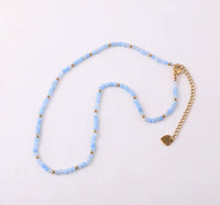 Un collier raffiné composé de pierres naturelles précieuses bleu ciel, sublimées par de délicates perles dorées. Sa teinte douce et apaisante apporte une élégance lumineuse, idéale pour sublimer un look quotidien ou plus habillé.