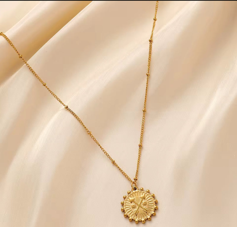 Un collier doré délicat, orné d’un médaillon boussole finement gravé. Symbole de direction et d’équilibre. Idéal pour un look féminin, raffiné et intemporel.