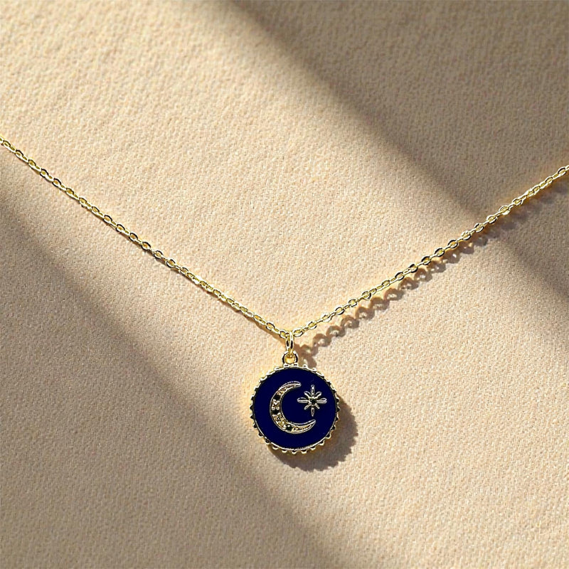 Un pendentif bleu profond orné d'une lune et d'une étoile dorées.