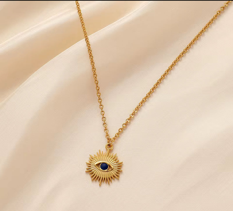 Un collier doré lumineux, orné d’un œil protecteur au cœur bleu. Symbole de clairvoyance et d’énergie. Idéal pour un look féminin, raffiné et intemporel.