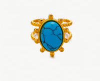 Une bague plaqué or au design perlé, ornée d’une pierre turquoise naturelle à l’éclat vibrant. Son allure majestueuse et bohème en fait une pièce forte, idéale pour sublimer votre style avec élégance et caractère.